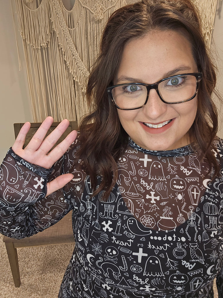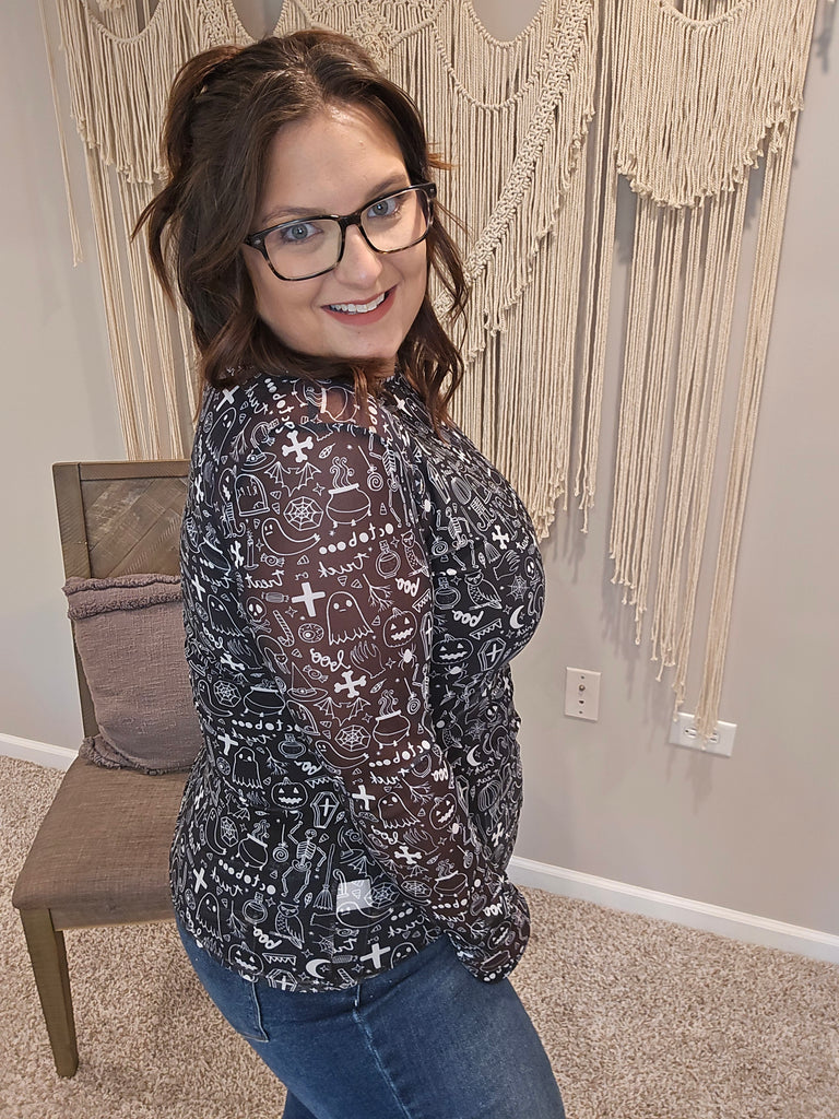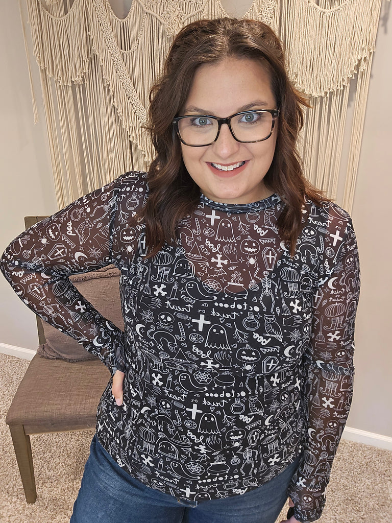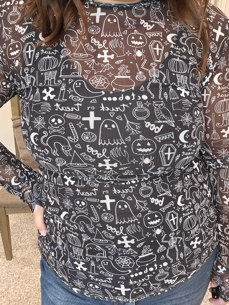 SPOOKTOBER is here with a brand new Halloween Mesh top! We love these tops because they are super stretchy with a crew neck, thumbhole detail sleeves, and a sheer fabric. They are lightweight so you can layer them without adding too much warmth, but also cute enough to wear on it's own. These are sheer though so you may want to layer at least a tank with it.