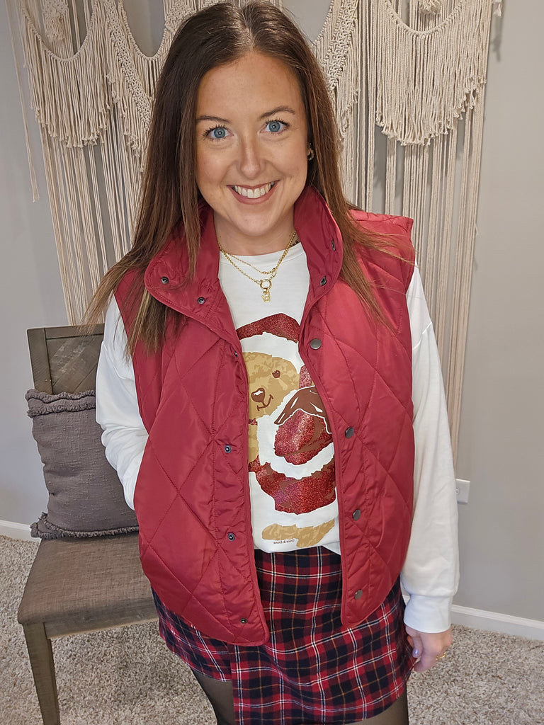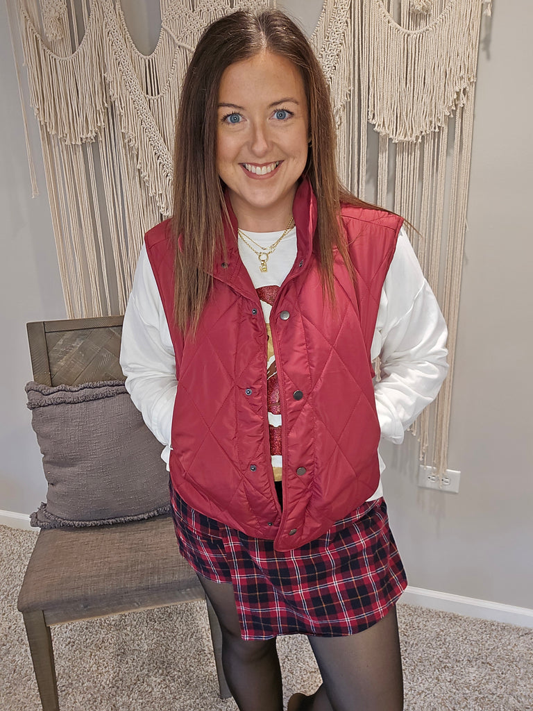 Stay cozy in this adorable quilted vest featuring a lightweight, padded design perfect for layering. The burgundy red hue pairs beautifully with everything in your wardrobe. Snap button closure makes getting dressed effortless, while the rounded hem adds a sweet, feminine touch. Practical side pockets keep your essentials close, and the full lining ensures comfort all day long. Your new go-to piece for casual chic vibes!