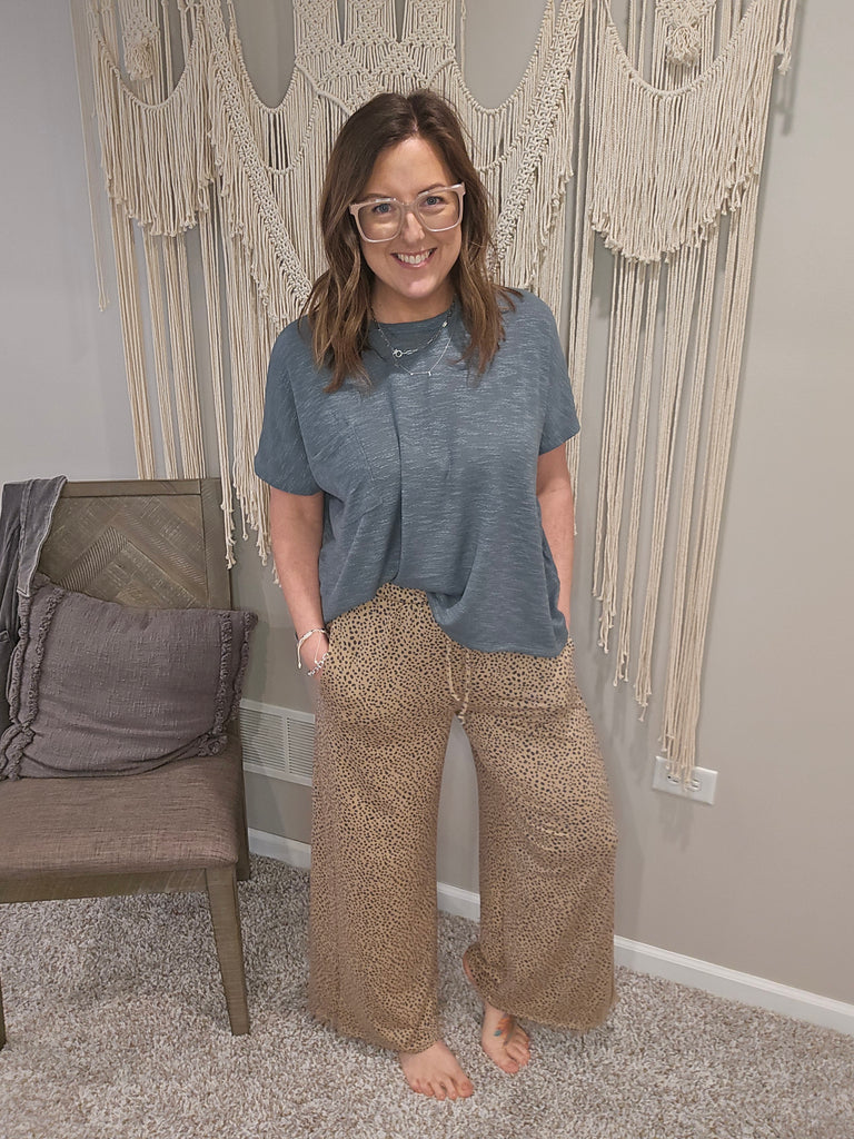 These are the perfect comfy, throw on and go style pants! They are soft and stretchy with an elastic waist band and a flowy wide leg. The neutral brown and gray dotted print is the perfect neutral.